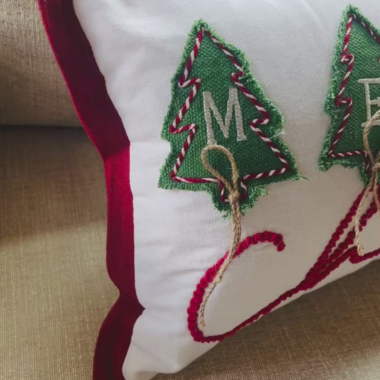 Merry Christmas Embroidered and Applique Tree with Jute Embellishments Throw Pillow